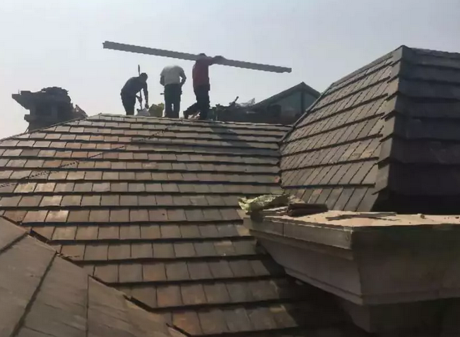 掛瓦條釘好之后,由下至上逐層恢復(fù)掛瓦,最頂層瓦片恢復(fù)后,用鋁板包住,并鋪貼防水卷材,與平面基層做好搭接,最終將屋面清理干凈。