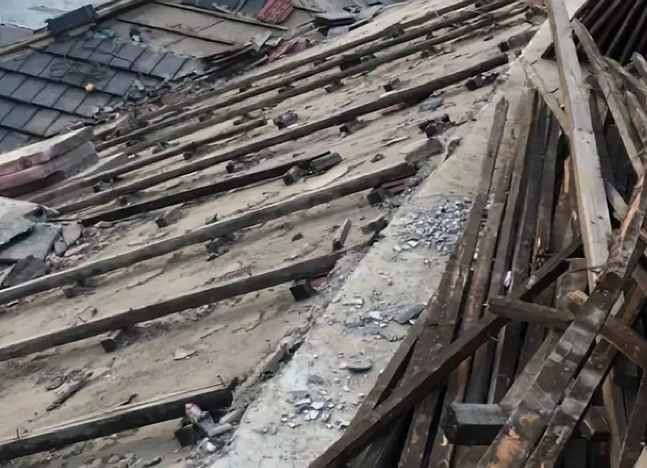 5、木條未做防腐處理,木條腐蝕斷裂部位瓦片松動(dòng),瓦片之間出現(xiàn)縫隙,雨水沿縫隙進(jìn)入下部;