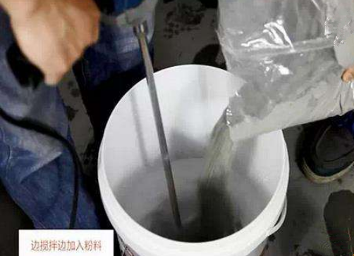 表面處理好后就可以開始調配好防水材料了,按照1:4的比例配制好,也不需要其他的溶劑,將產品中的搭配好的兩個組份進行不斷攪拌,直至糊狀即可。