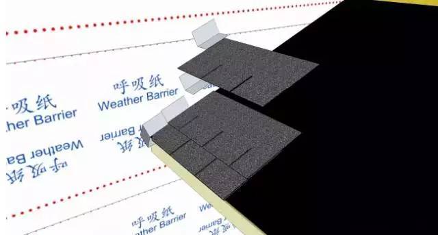很多施工人員使用整條的金屬泛水板或防水卷材安裝在墻體與屋面的交接位置,但這會使從瓦片邊緣流入下方的水再無法被帶回到瓦片上方。這就大大增加了漏水的可能性,而階梯式泛水板是解決該問題的最佳選項,且其安裝過程并不會過于繁瑣。標準瀝青瓦上的階梯式泛水板長度約180mm,公制瀝青瓦上的階梯式泛水板長度約200mm。