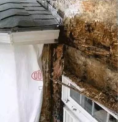 起始條瀝青瓦之間的接縫和第一道瀝青瓦之間的接縫剛好重合會導致漏水,這種情況出奇的多。這種布置會造成檐口每900mm出現一處漏水點,導致椽條尾部、墻體覆面板、頂梁板和石膏板全部潮濕并腐爛。
